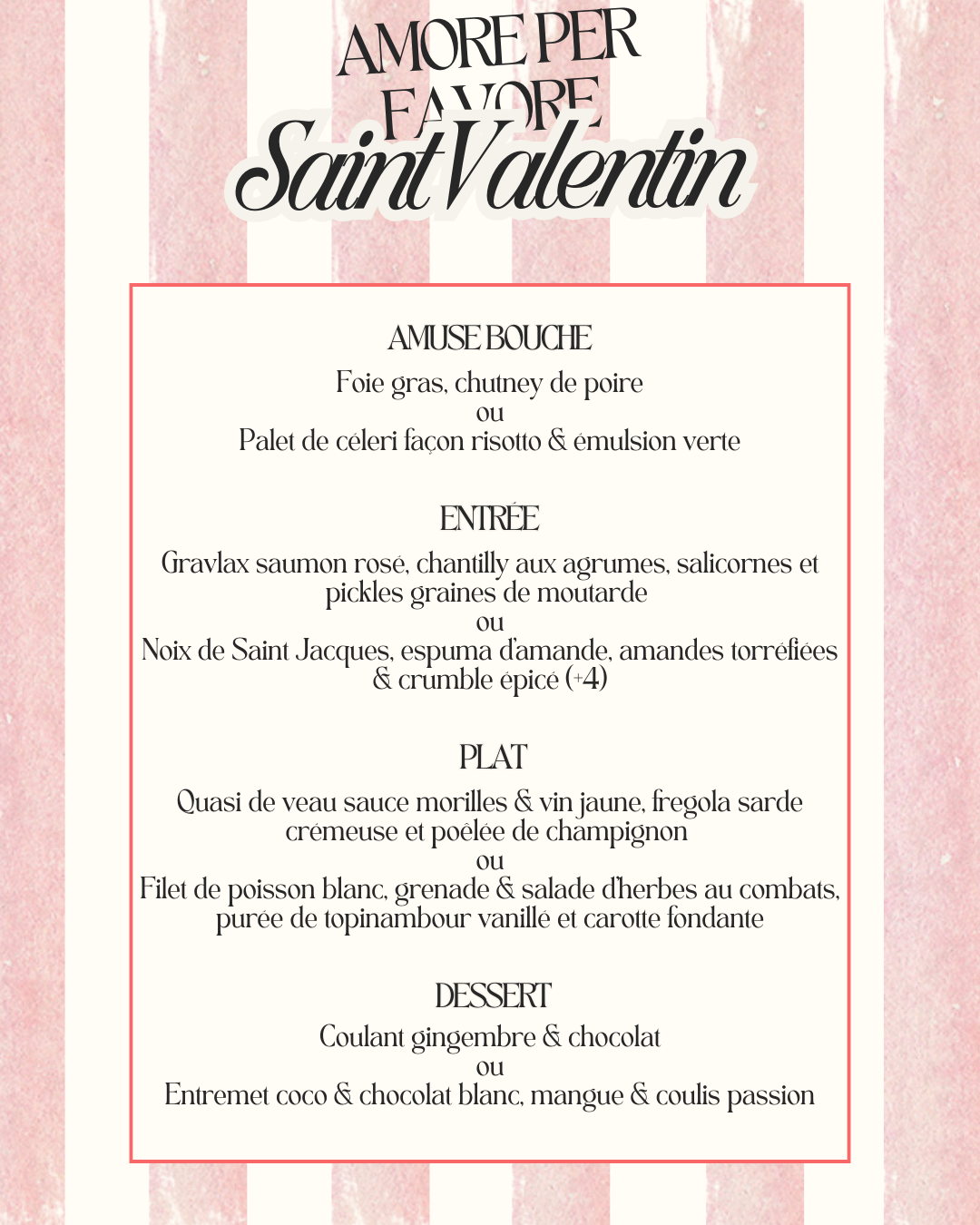 Un menu imaginé spécialement pour l’occasion, servi uniquement ce soir-là, pensé pour le plaisir de la table et le goût du moment.À venir déguster en amoureux, ou entre amis.